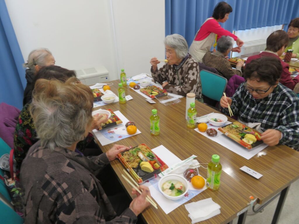 お食事は鶏ごぼうご飯弁当に民生委員児童委員さん手作りの温かいお吸い物、デザートなど盛りだくさんでした。みなさんで楽しくおしゃべりしながらお食事をいただきました。